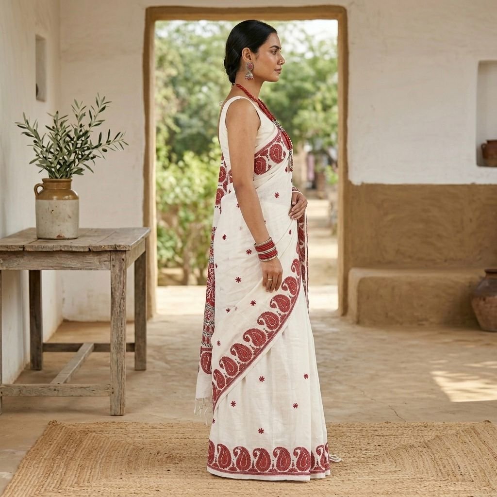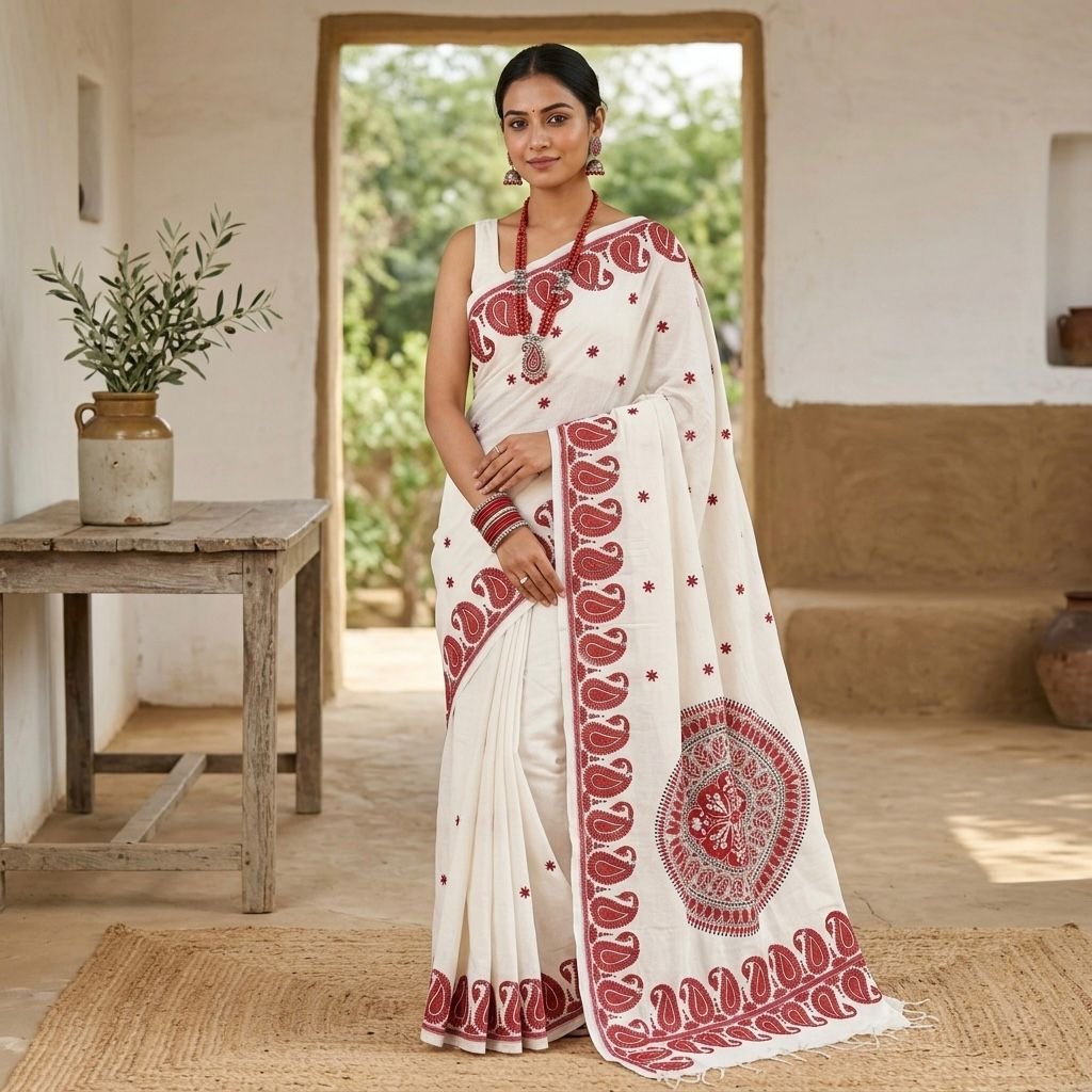 Made from 100% authentic Khadi Cotton, this saree ensures breathability, softness, and all-day comfort. Its generous dimensions—6.5 meters in length and 45 inches in width—offer optimal draping for an effortlessly elegant look.